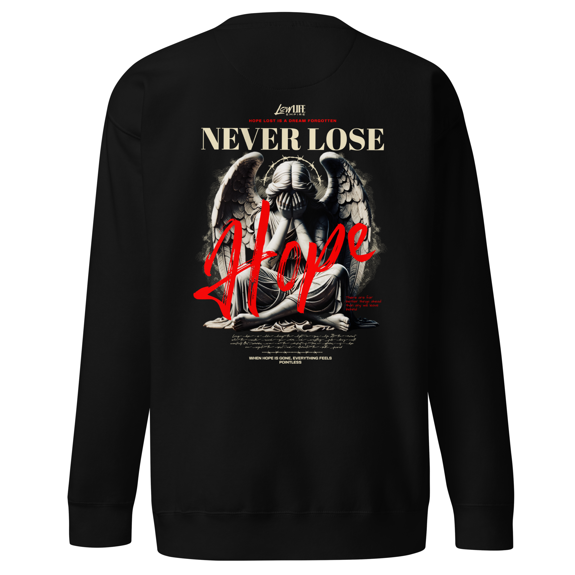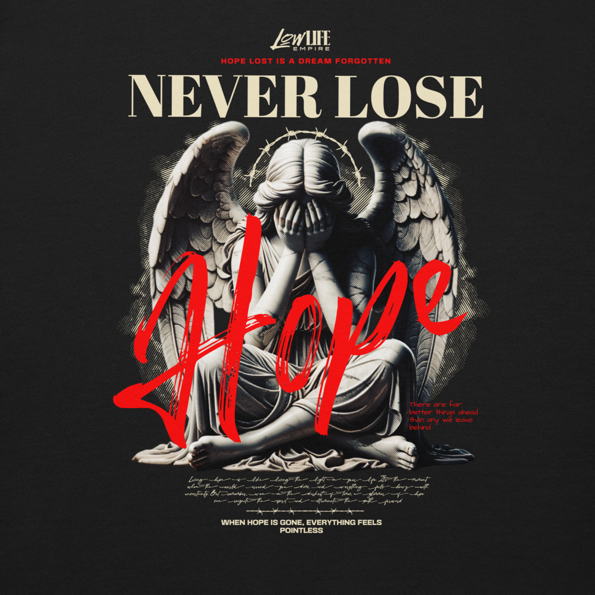 The back commands attention with “SIN 4 SURVIVAL” in unapologetic red, flanked by symbolic imagery that suggests conflict, consequence, and duality. The front delivers a powerful composition layered with the statement “Never Lose Hope,” creating contrast between darkness and endurance.