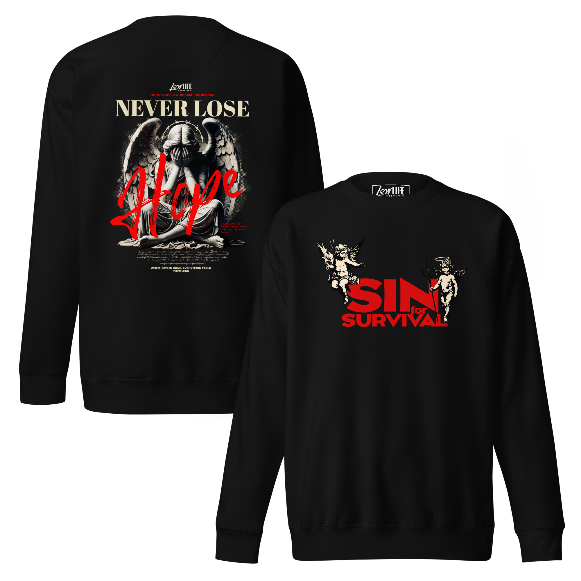 The SIN4SURVIVAL Premium Sweatshirt explores the tension between desperation and resilience. Featuring bold front and back graphics, this piece speaks to the reality that not every battle is clean—and not every lesson is gentle.