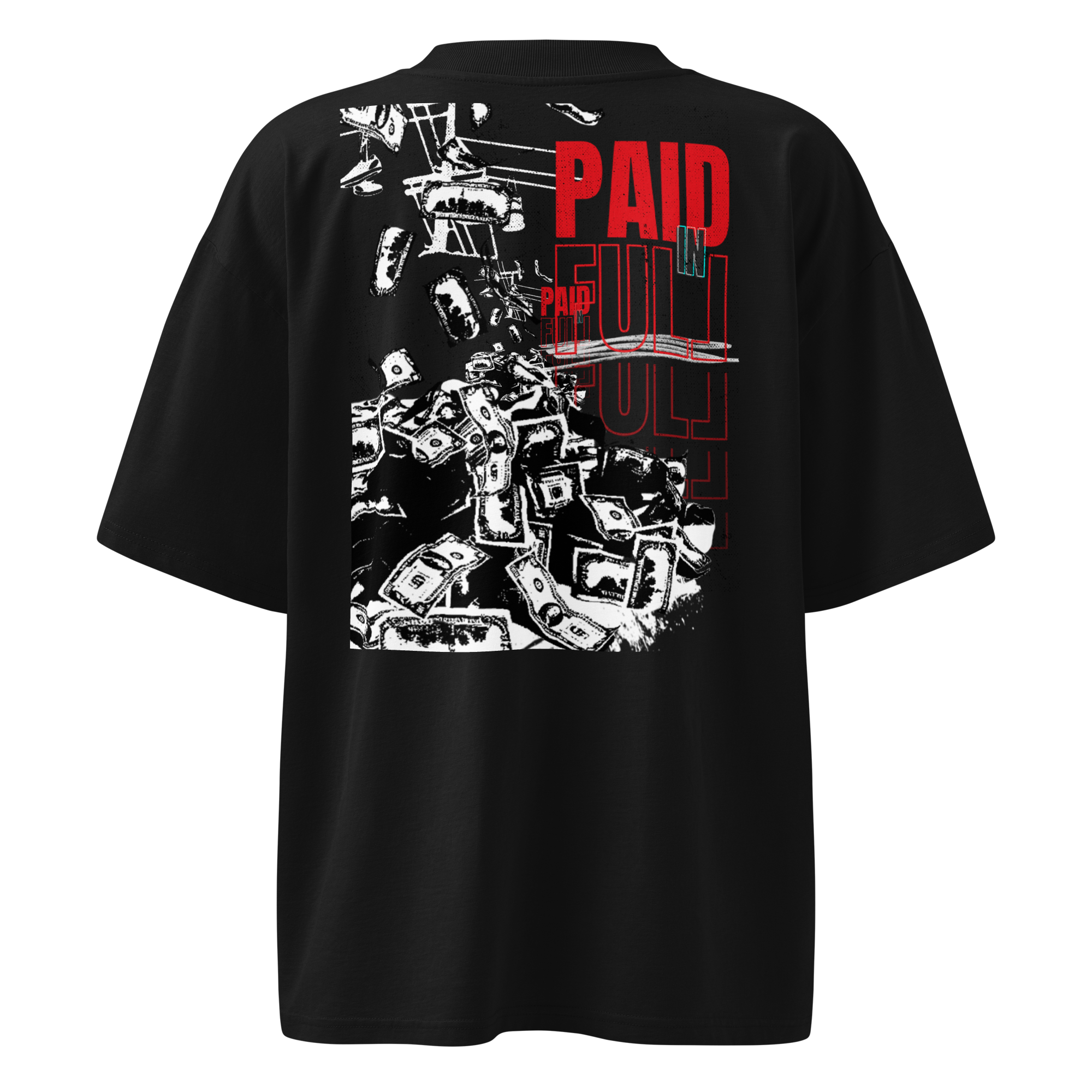 Back Design: “PAID IN FULL” typography with high-contrast money collage