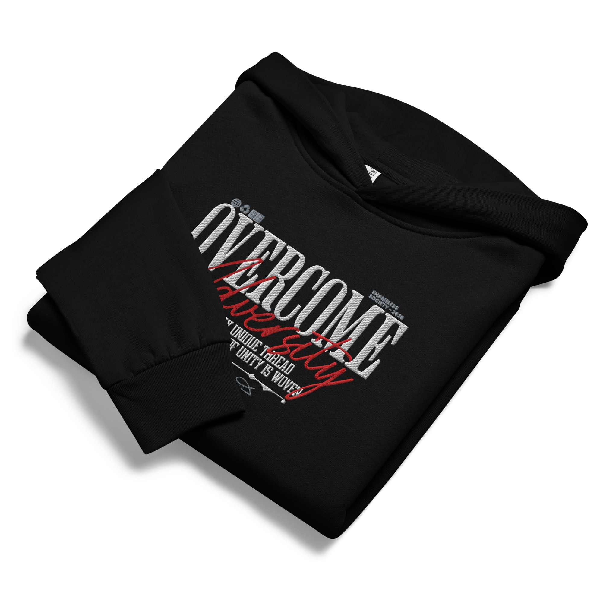 Premium embroidered OVERCOME ADVERSITY detail