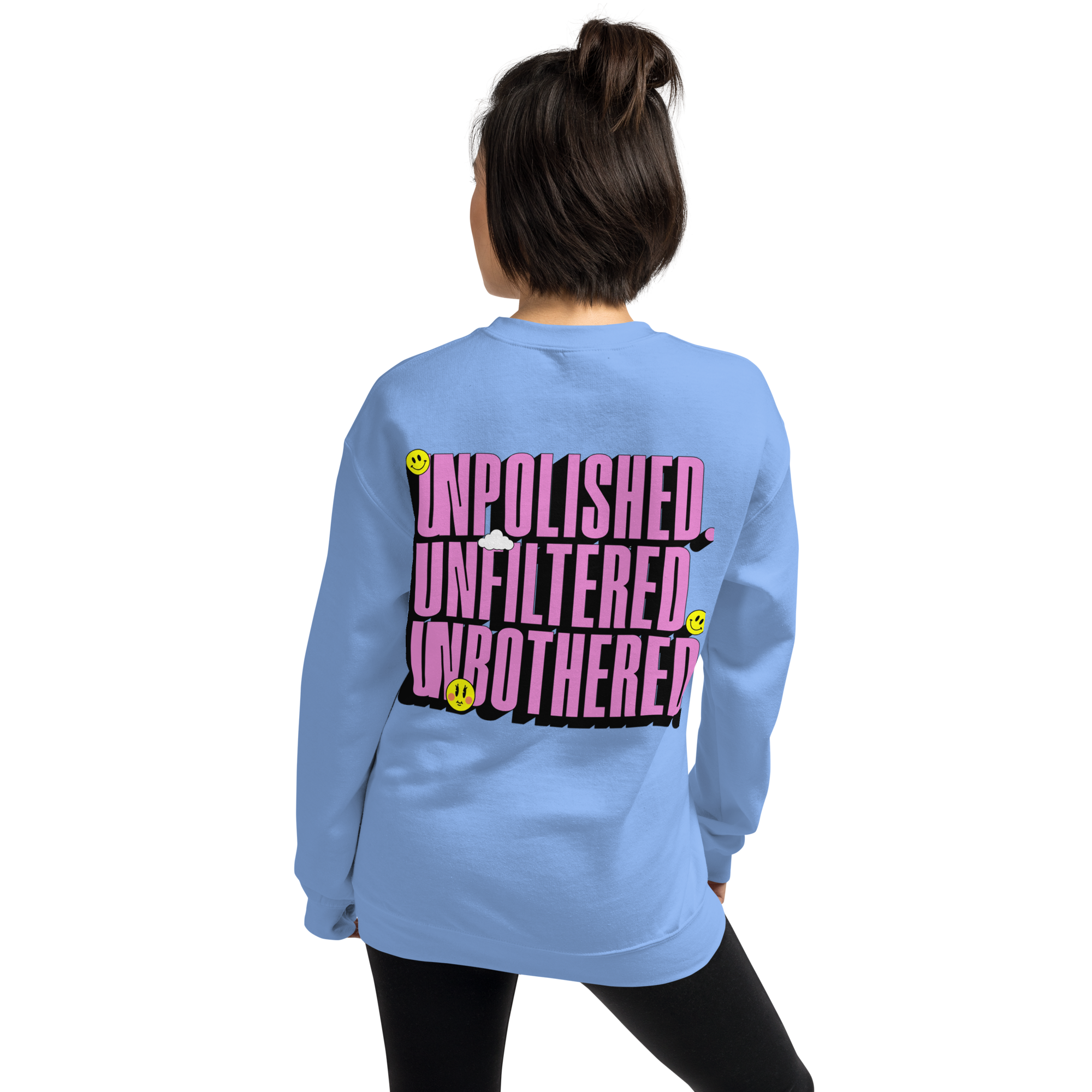 The back tells the full story. “Unpolished. Unfiltered. Unbothered.” stretches across the sweatshirt, surrounded by expressive face emojis and cloud graphics—representing emotion, pressure, chaos, and the mental distance you’ve learned to keep. It’s raw, imperfect, and intentional. Exactly the point.