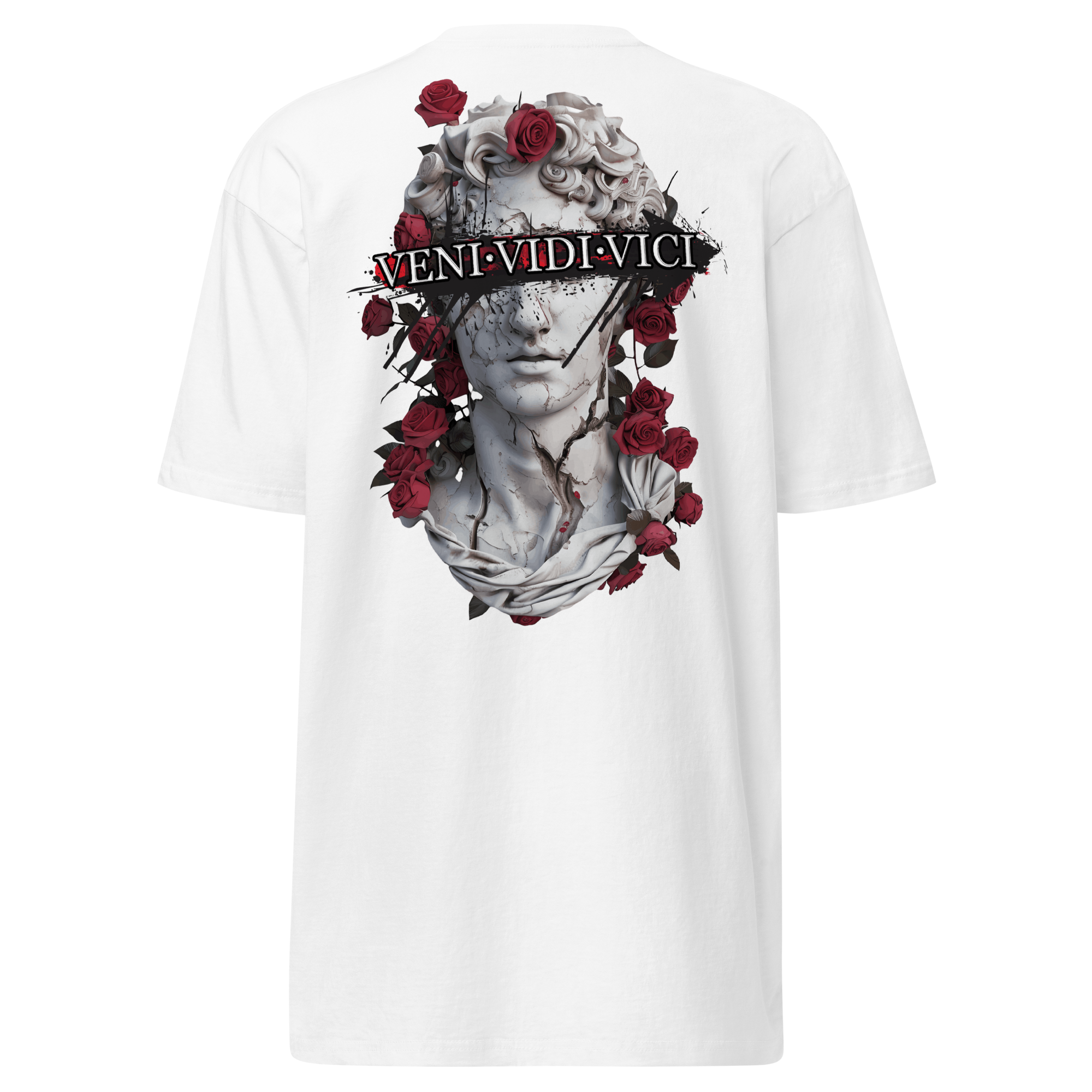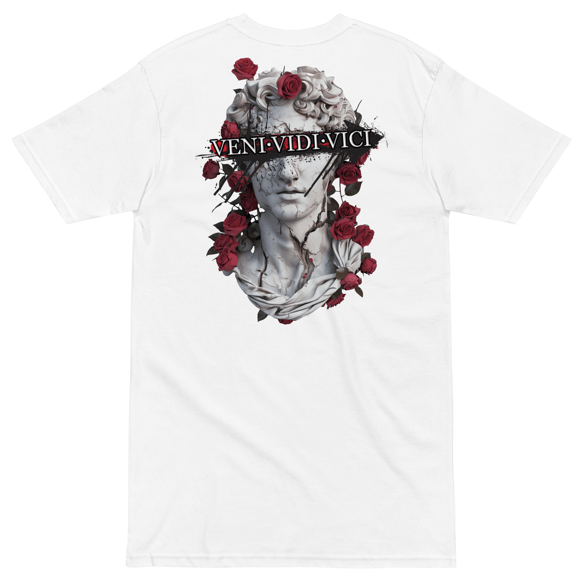 The VINI VIDI VICI Men’s Premium Graphic Tee channels classical power into modern defiance. Featuring a striking marble bust fractured with intensity and surrounded by deep red roses, this design represents resilience through pressure and beauty forged in adversity.