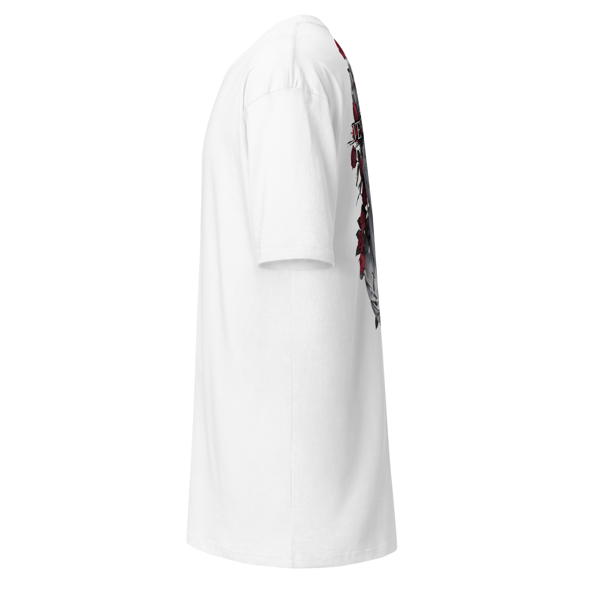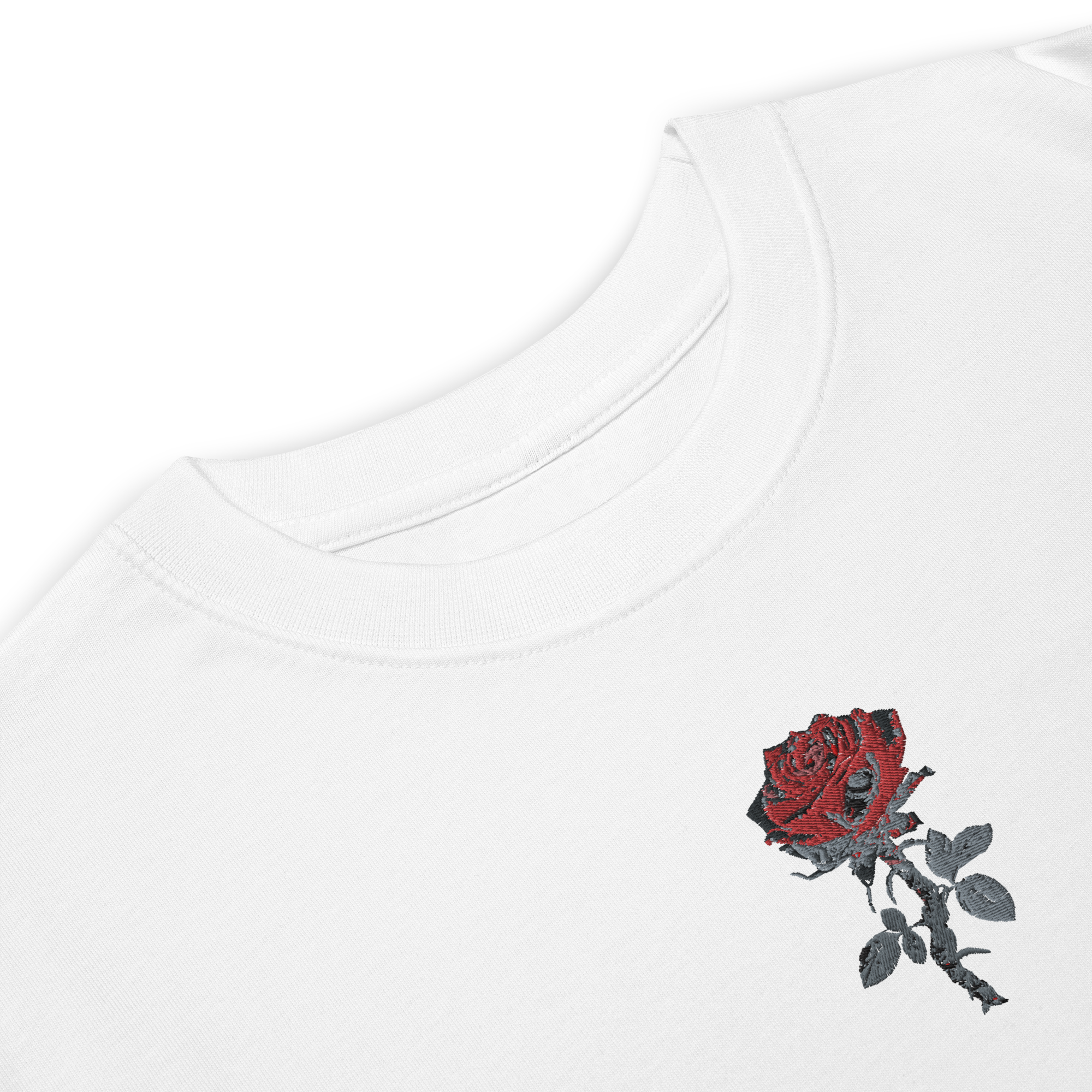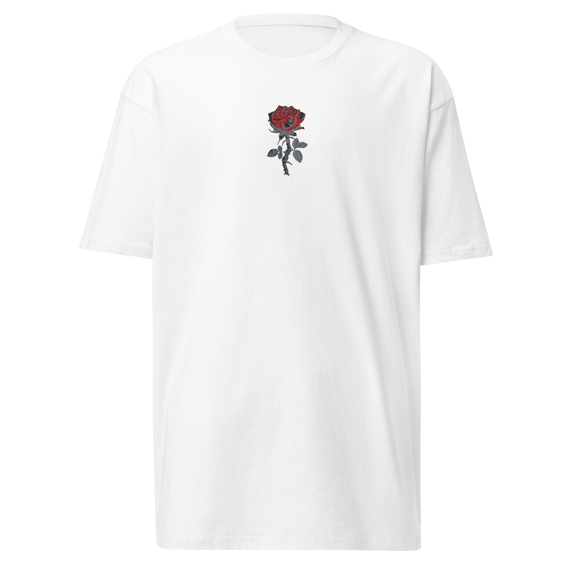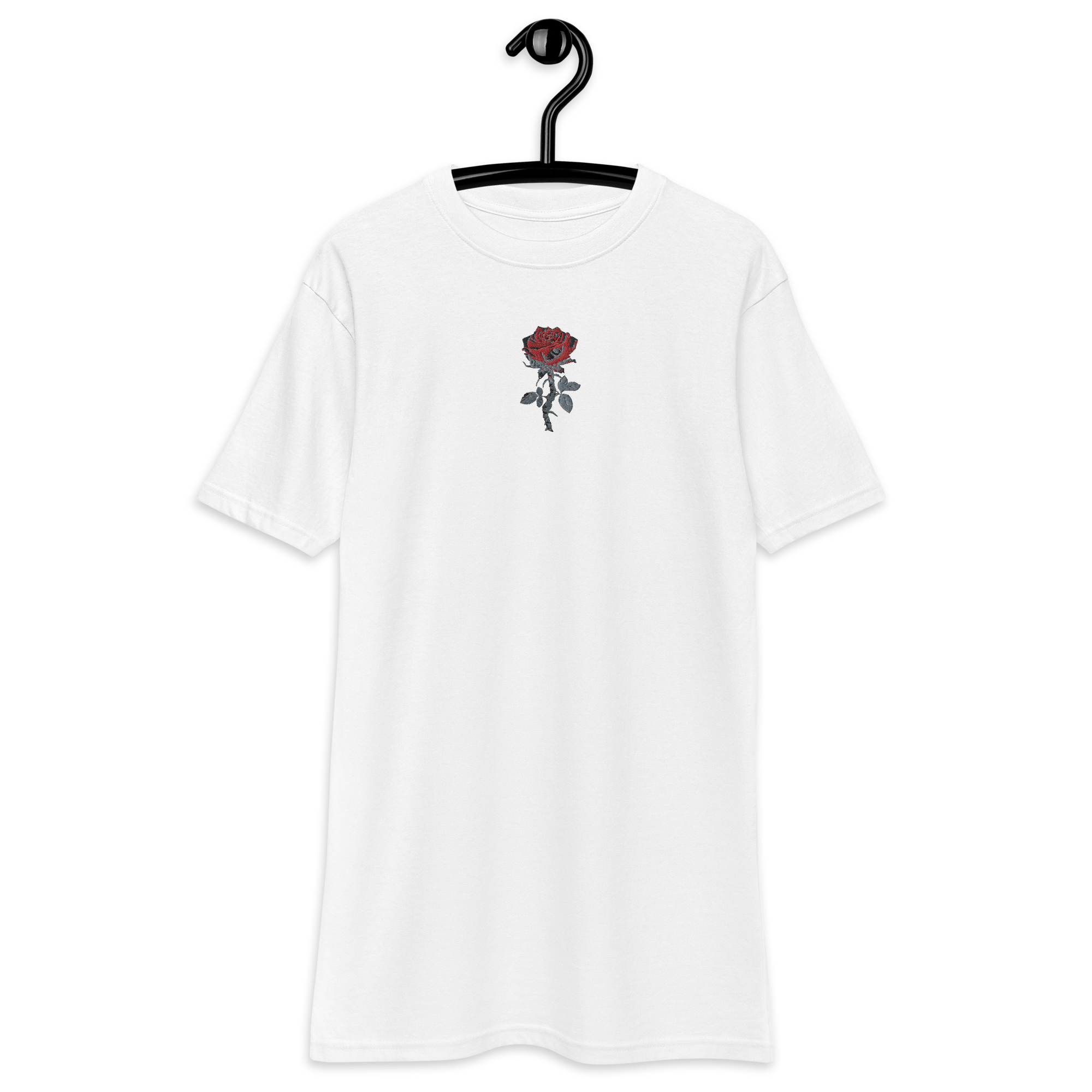 The front features a subtle rose chest hit for minimal elegance. The back commands attention with the full artistic statement.